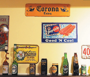 牆上掛滿鐵製車牌和造型各異的飲料瓶,以小成本塑造異國風。